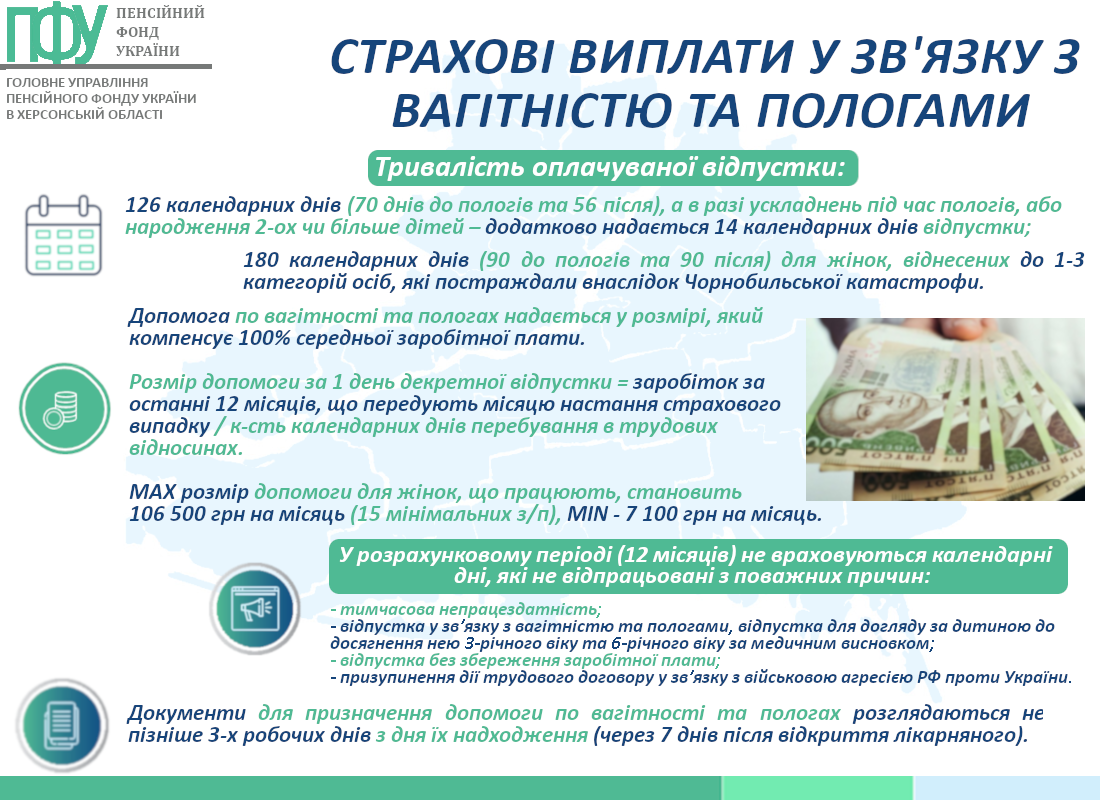 Основним нормативним актом, що регулює питання надання допомоги по вагітності та пологах, є Закон України “Про загальнообов’язкове державне соціальне страхування”. Згідно з цим законом, допомога надається у розмірі 100% середньої заробітної плати або доходу застрахованої особи.