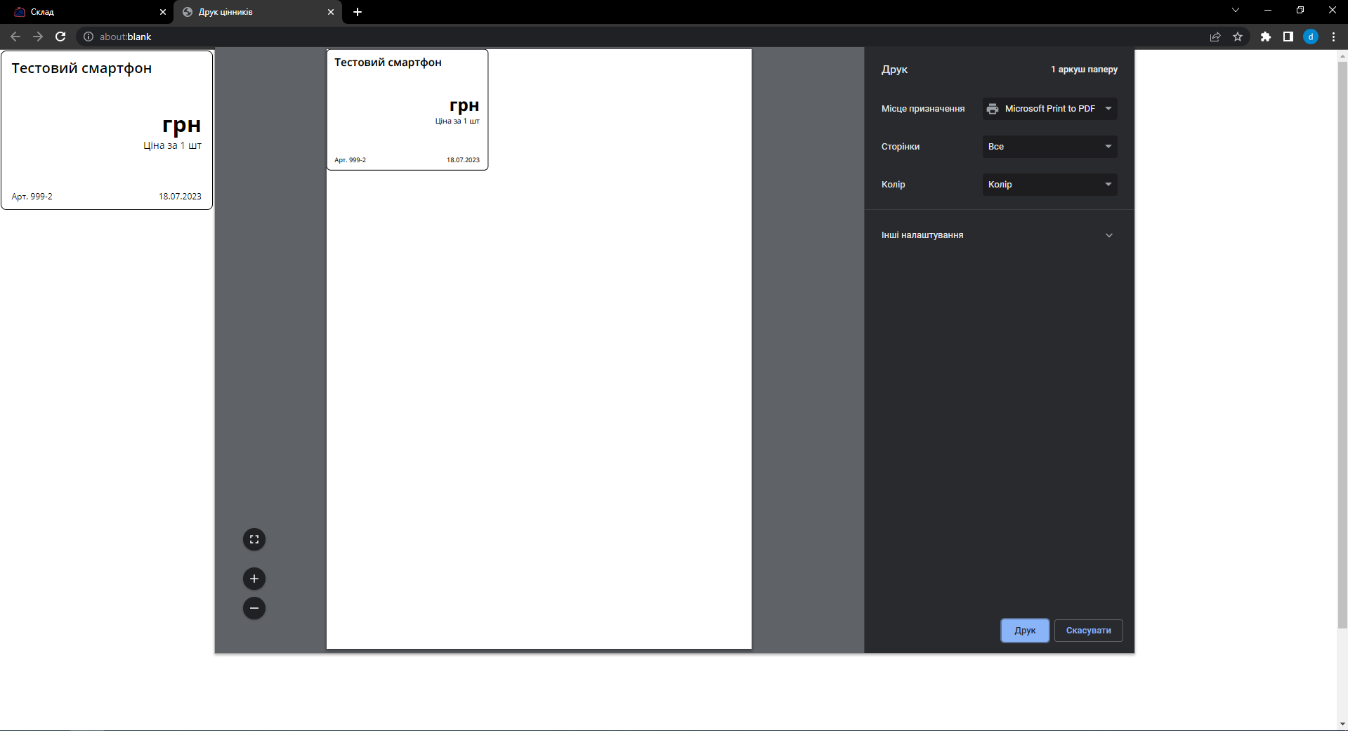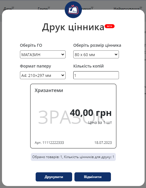 При натисканні на кнопку «Друкувати» відкриється нове вікно, де можна переглянути як будуть розміщені цінники на папері та роздрукувати їх.