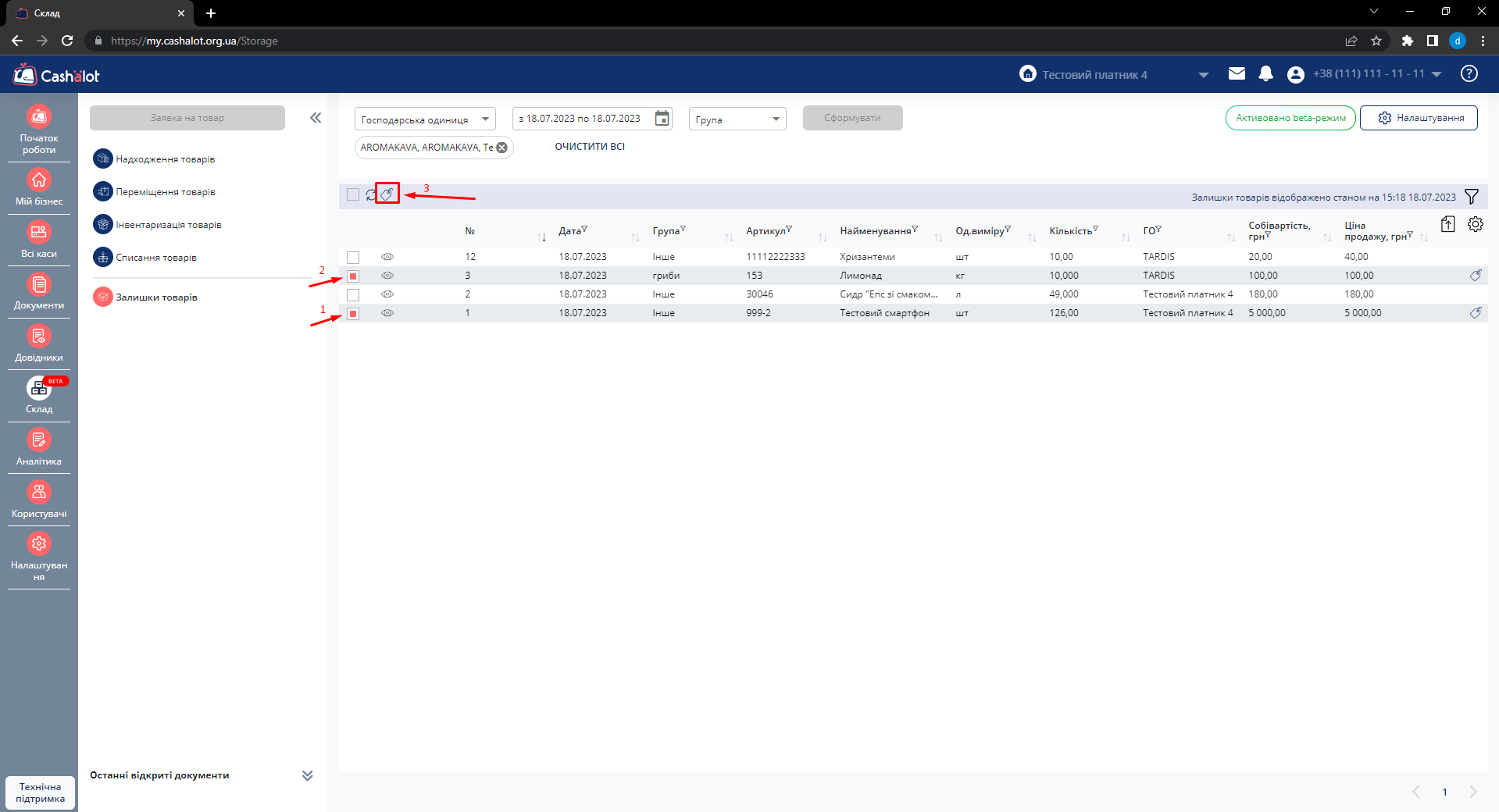Щоб роздрукувати декілька цінників потрібно встановити на них відмітки, після чого на панелі інструментів з’явиться опція Друк цінників.