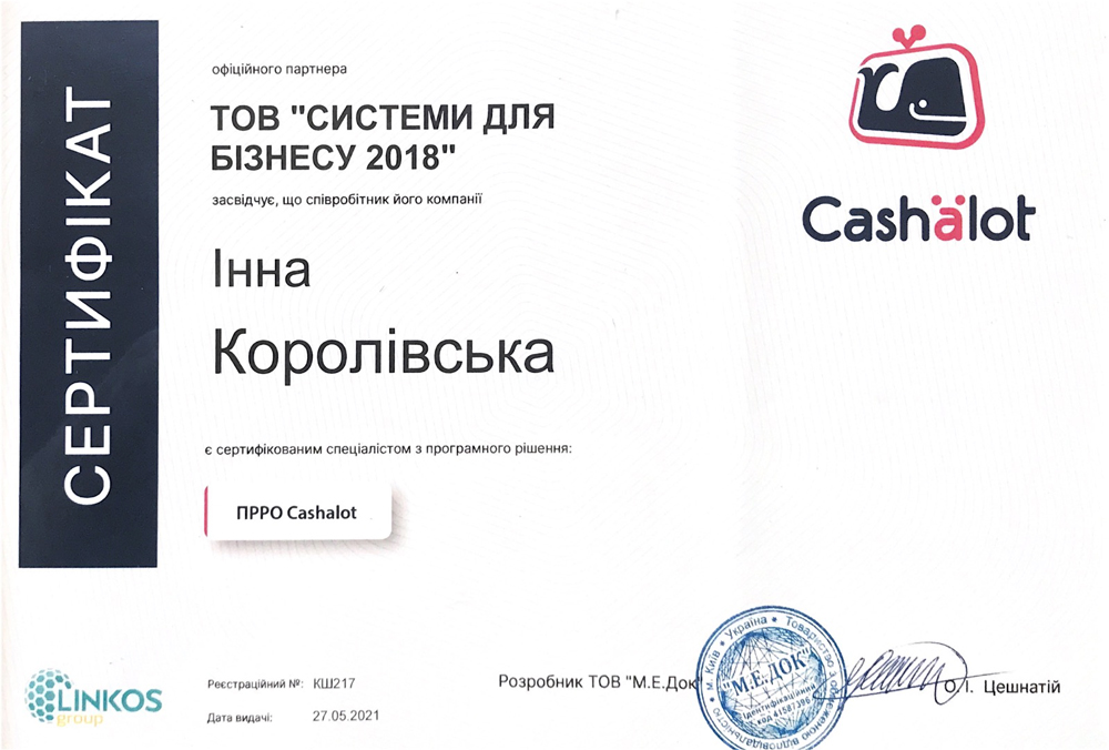 Сертификат специалиста ПРРО Cashalot