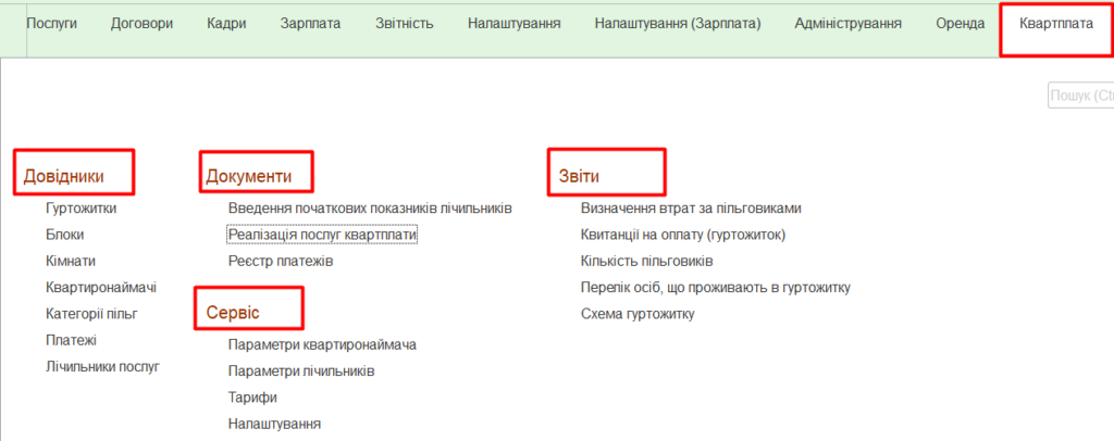 Доработка «Квартплата» имеет интуитивно понятный интерфейс, разделенный на основные сегменты: «Справочники», «Документы», «Сервис» и «Отчетность». Эти блоки обеспечивают удобное управление всеми аспектами квартплаты.