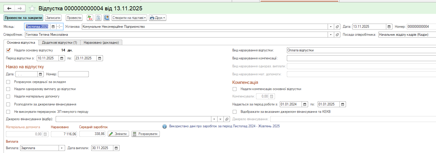 Отпуска: Следует отразить отсутствие сотрудника в связи с отпуском. Для этого создается документ «Отпуск» с указанием сроков, а расчет отпускных произойдет автоматически.