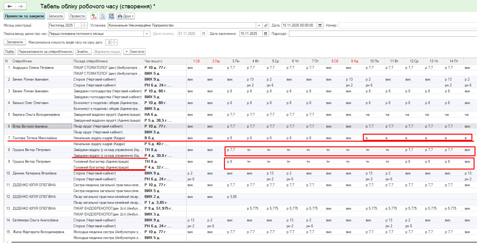 Для КНП ЗОЗ с большим количеством персонала ведение полного табеля дважды в месяц создает значительную нагрузку на кадровиков. Поэтому фактически может применяться Формальный табель (промежуточный) — составляется за период с 1-го по 15-е число. Он может не содержать всех мелких деталей (например, сверхурочных), но обязательно должен фиксировать факт присутствия работника на работе.