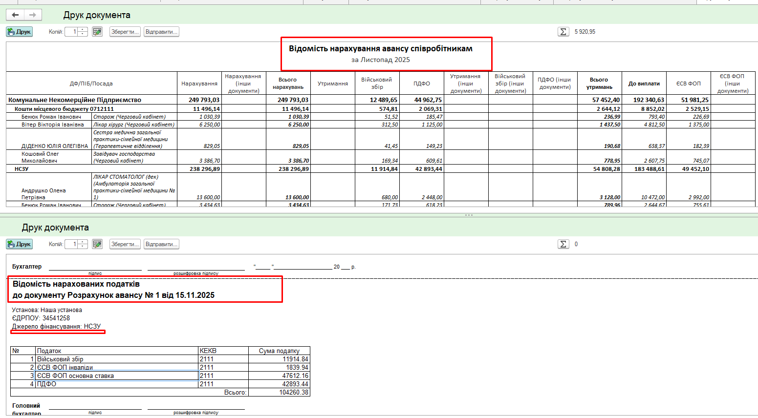 После этого станут доступны печатные формы: «Ведомость расчета аванса» и, при необходимости, отдельные итоговые данные по налогам и сборам.