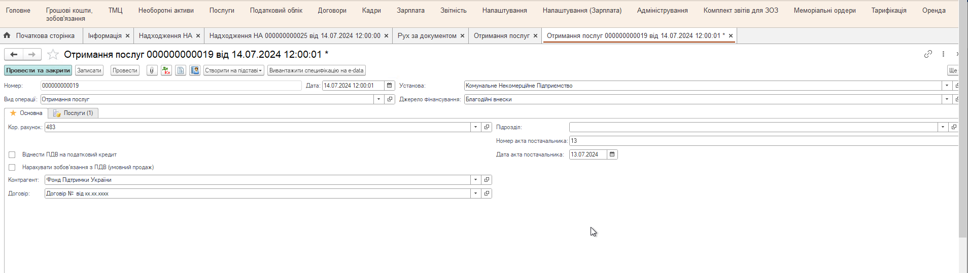 Перейдем в подсистему Услуги → Полученные услуги → нажмем кнопку Создать. В открывшемся документе последовательно заполним следующие поля: