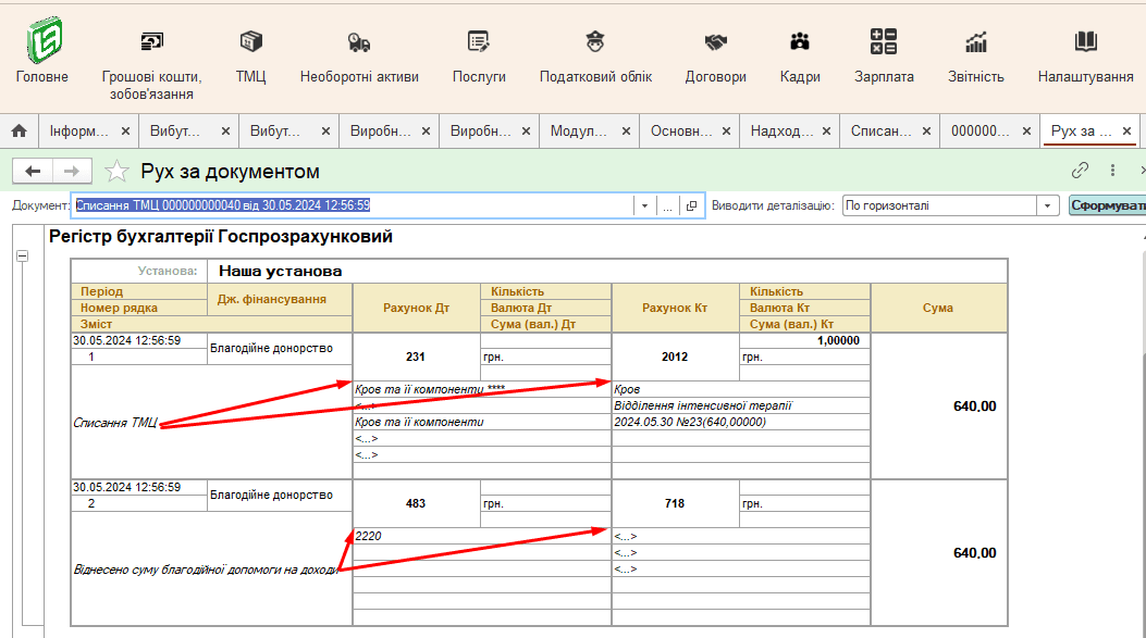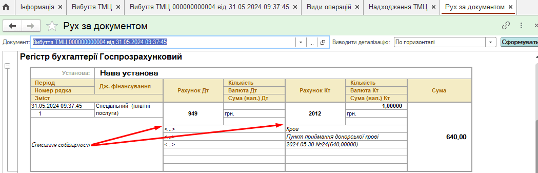 Документ «Выбытие ТМЦ», Вид операции «Внутриведомственная передача безвозмездно полученных ТМЦ»