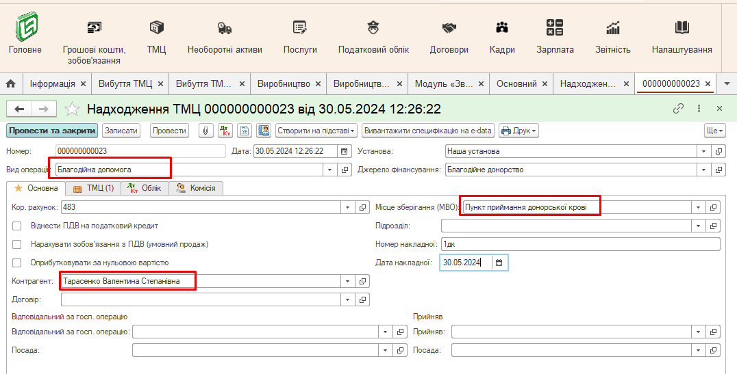 Документ «Поступление ТМЦ», Вид операции «Благотворительная помощь»