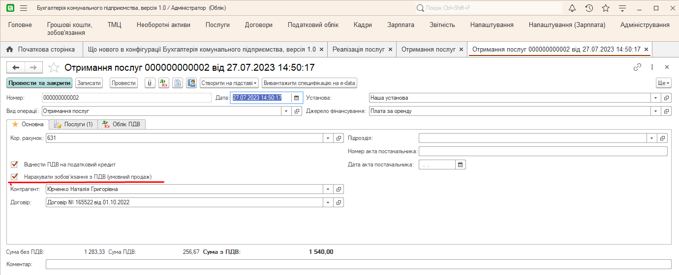 - Далее создадим документ Получение услуг и установим флажок Отнести НДС на налоговый кредит