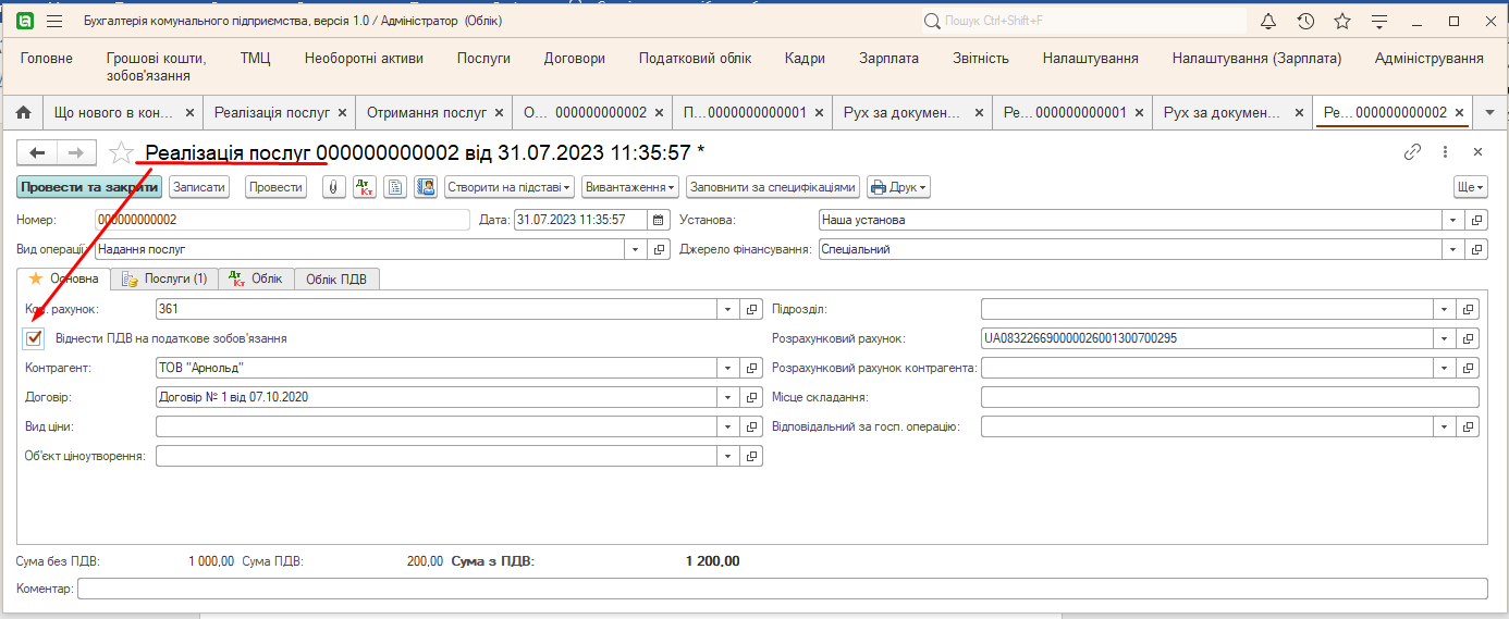 - Создадим документ Реализация услуг установив флажок «Унести НДС на налоговое обязательство».