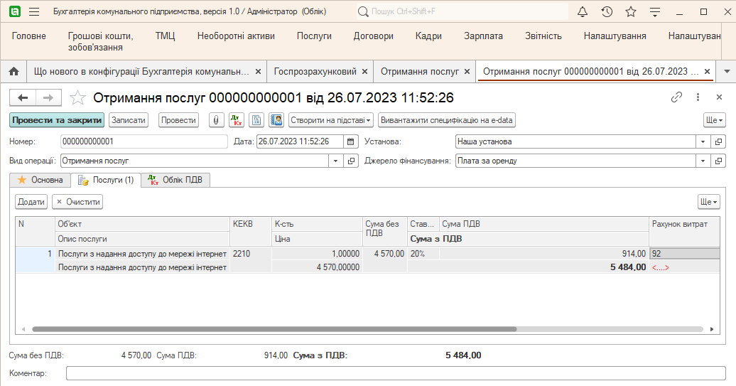 - Создадим документ Получение услуг и установим флажок Отнести НДС на налоговый кредит.