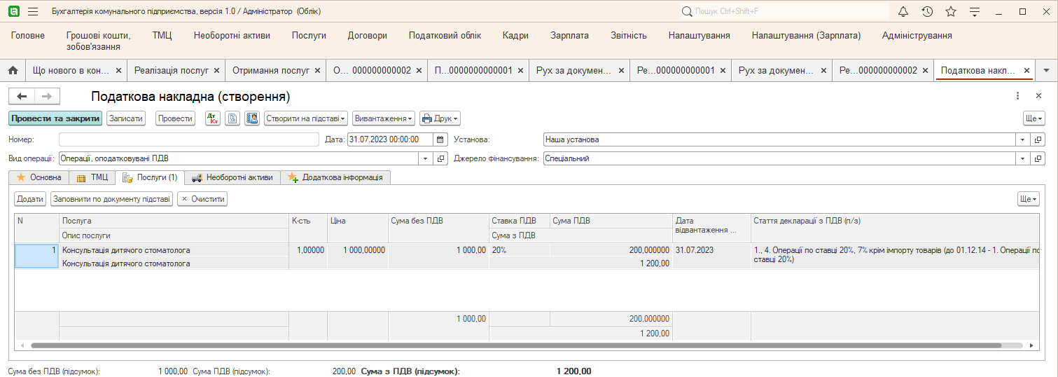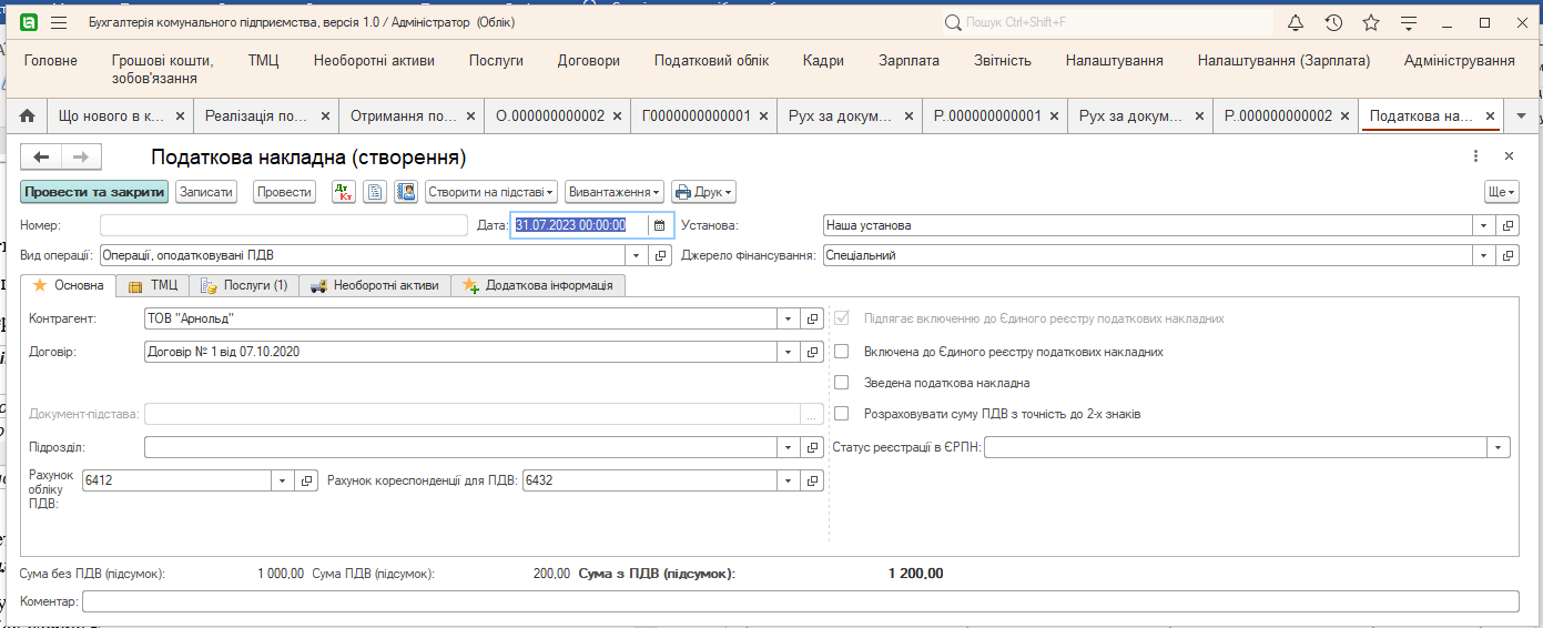- Нажав Создать на основании → Налоговую накладную, получим готовый документ Налоговая накладная.