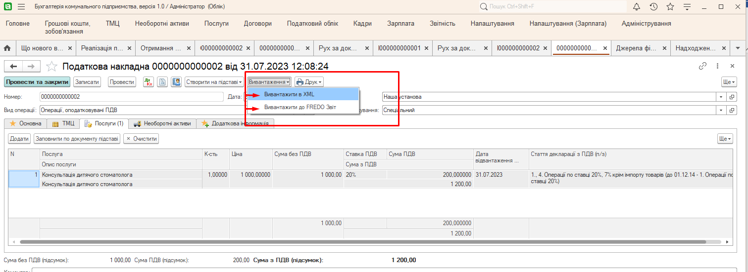 - выгрузить в XML – происходит выгрузка в формате XML для дальнейшей загрузки в другие ПП для отправки, например MEDOC;