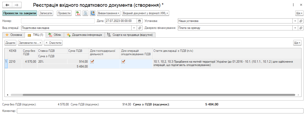 В результате такого действия получим готовый Входной налоговый документ со всеми заполненными данными, указанными в документе Получение услуг, далее необходимо лишь добавить реквизиты по ЕРНН.