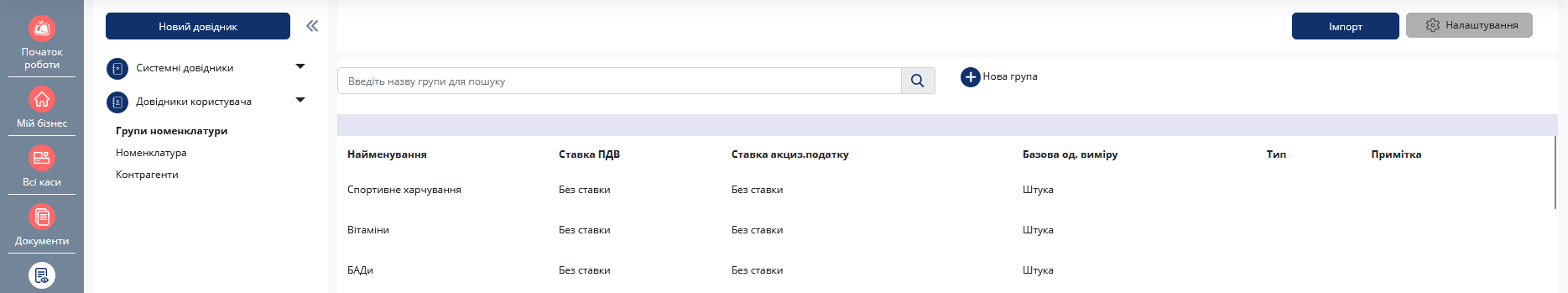 Установили программу на ПК, зарегистрировали кассиров в ГНС и настроили справочник номенклатуры. Для удобства товары были разделены на группы (БАДы, витамины, спортивное питание).