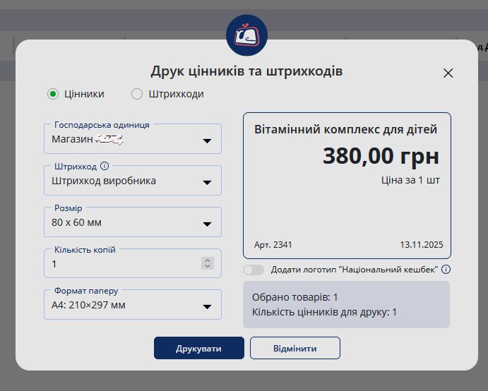 Также реализована печать ценников непосредственно из Cashalot.