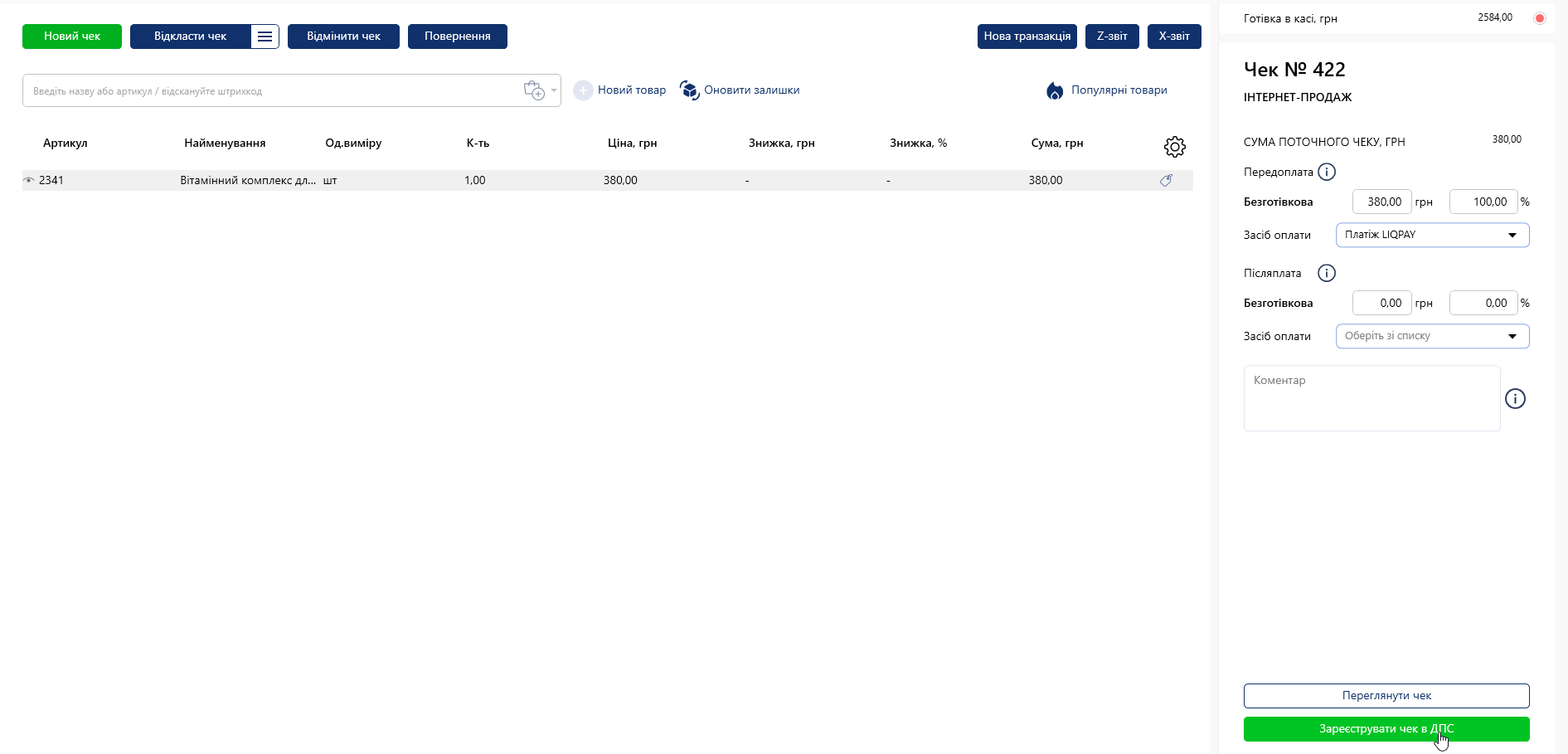 - Интернет-эквайринг: фискализация оплат через сайт (LiqPay).